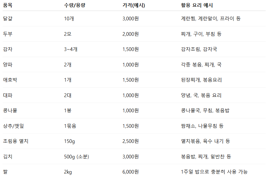 이제 이론은 충분하니, 실제 예산으로 장을 보면 어떤 구성일까요? 아래는 2인 가족이 전통시장에서 약 3만 원대로 구성한 장보기 리스트입니다.